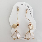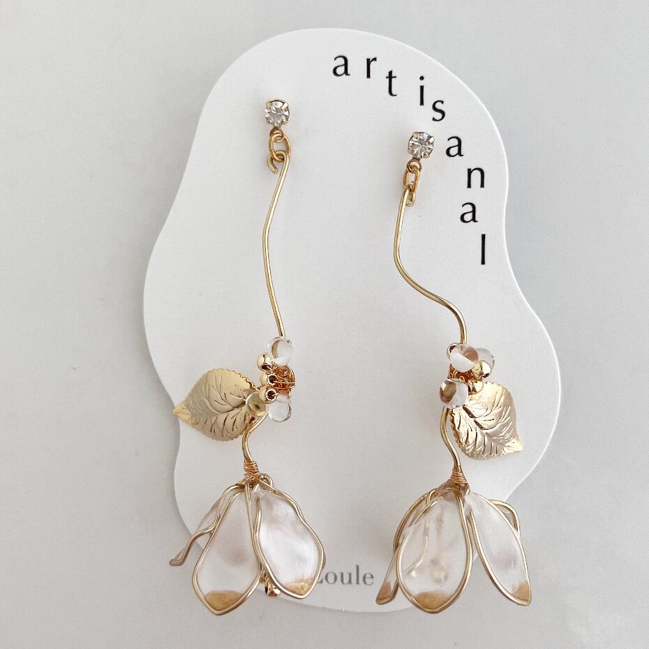 花びらの先が色づいているグラデーションカラーがポイントの花モチーフ。リアルな葉っぱやおしべがついていたり、小さなガラスがあしらわれていたり、ディテールにこだわったピアスです。