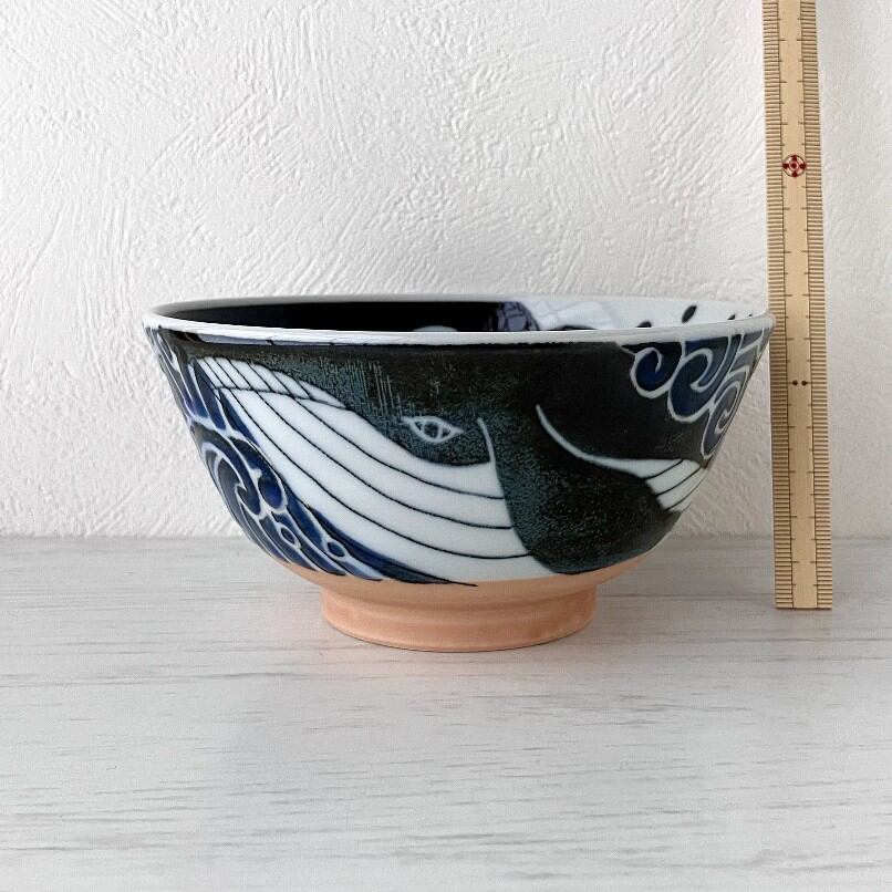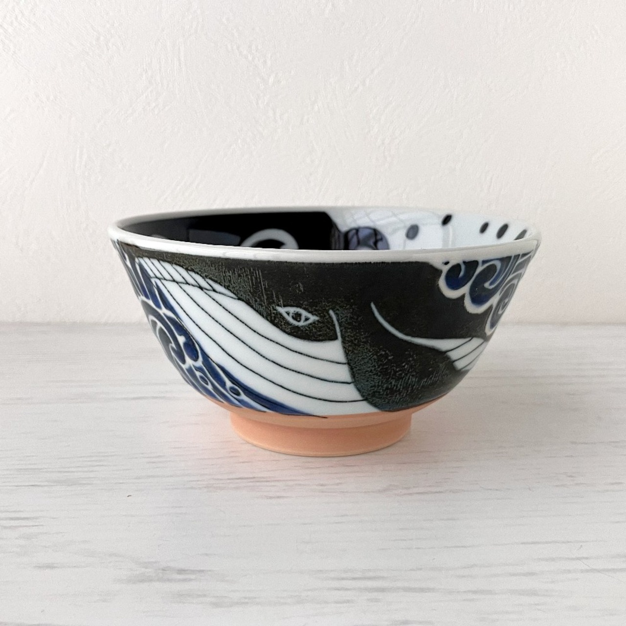 内側にも外側にも荒波を泳ぐクジラが描かれた小さめの丼です。