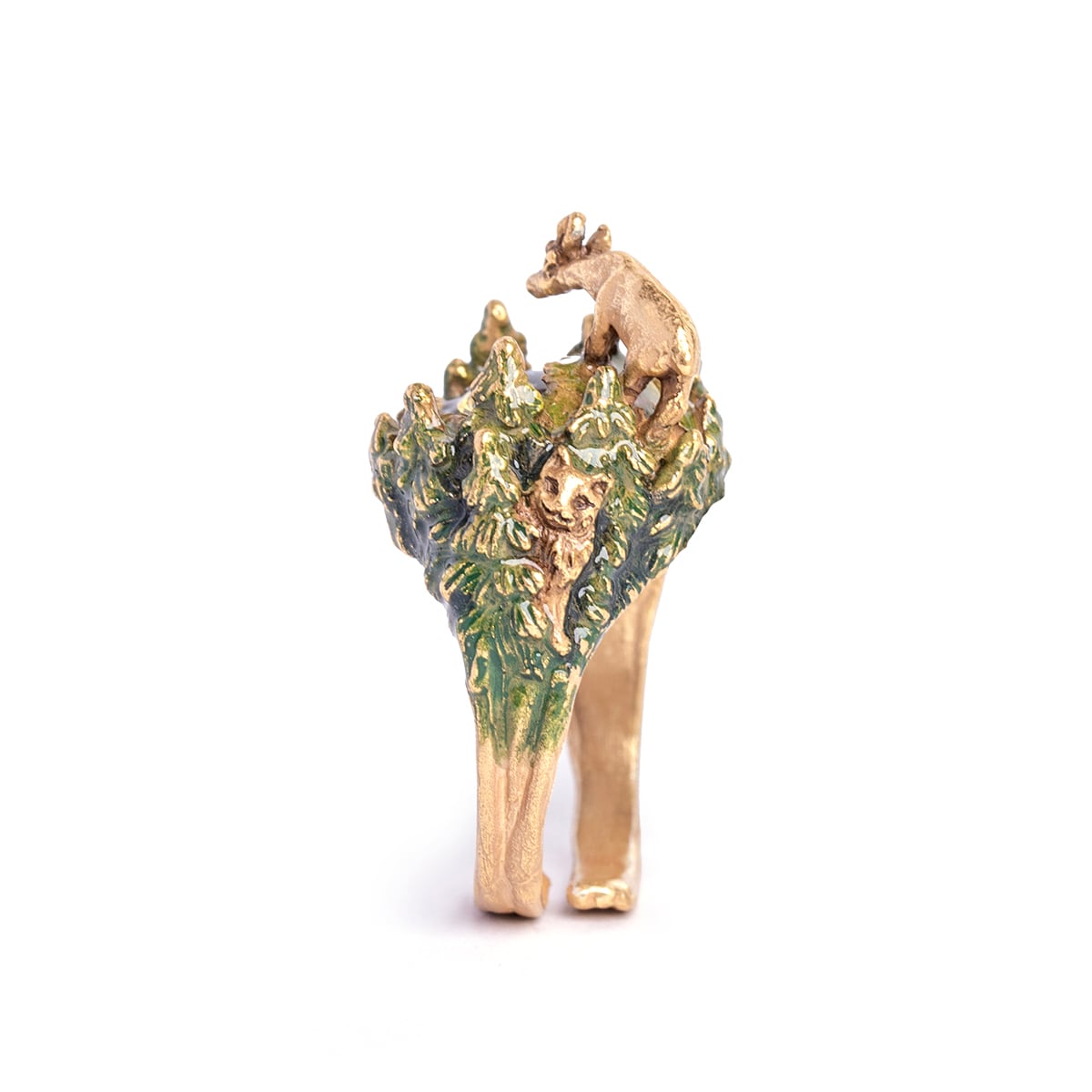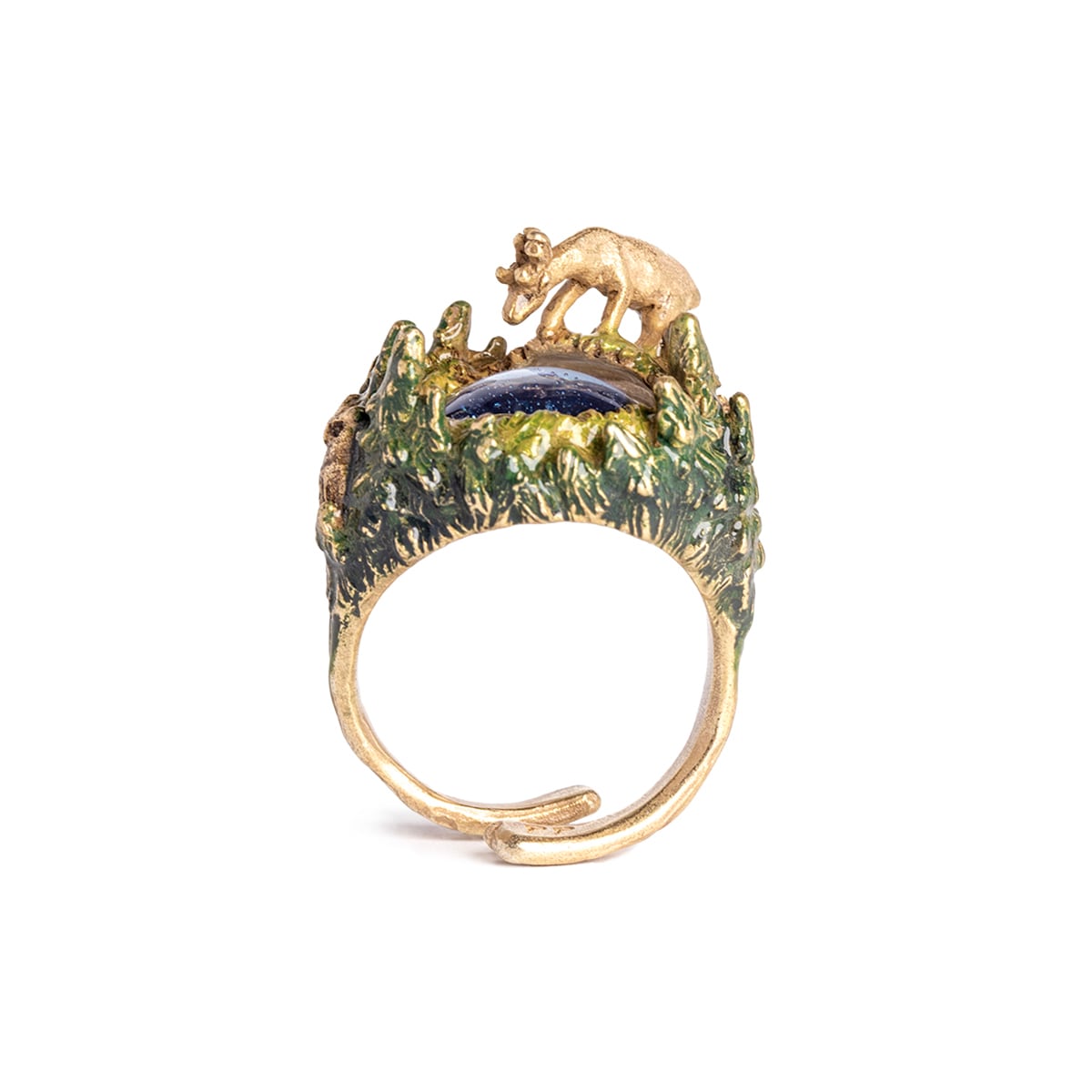 リングの側面になる部分にはヤマネコやミミズクが顔をのぞかせ、どの角度からも楽しめるデザインになりました。