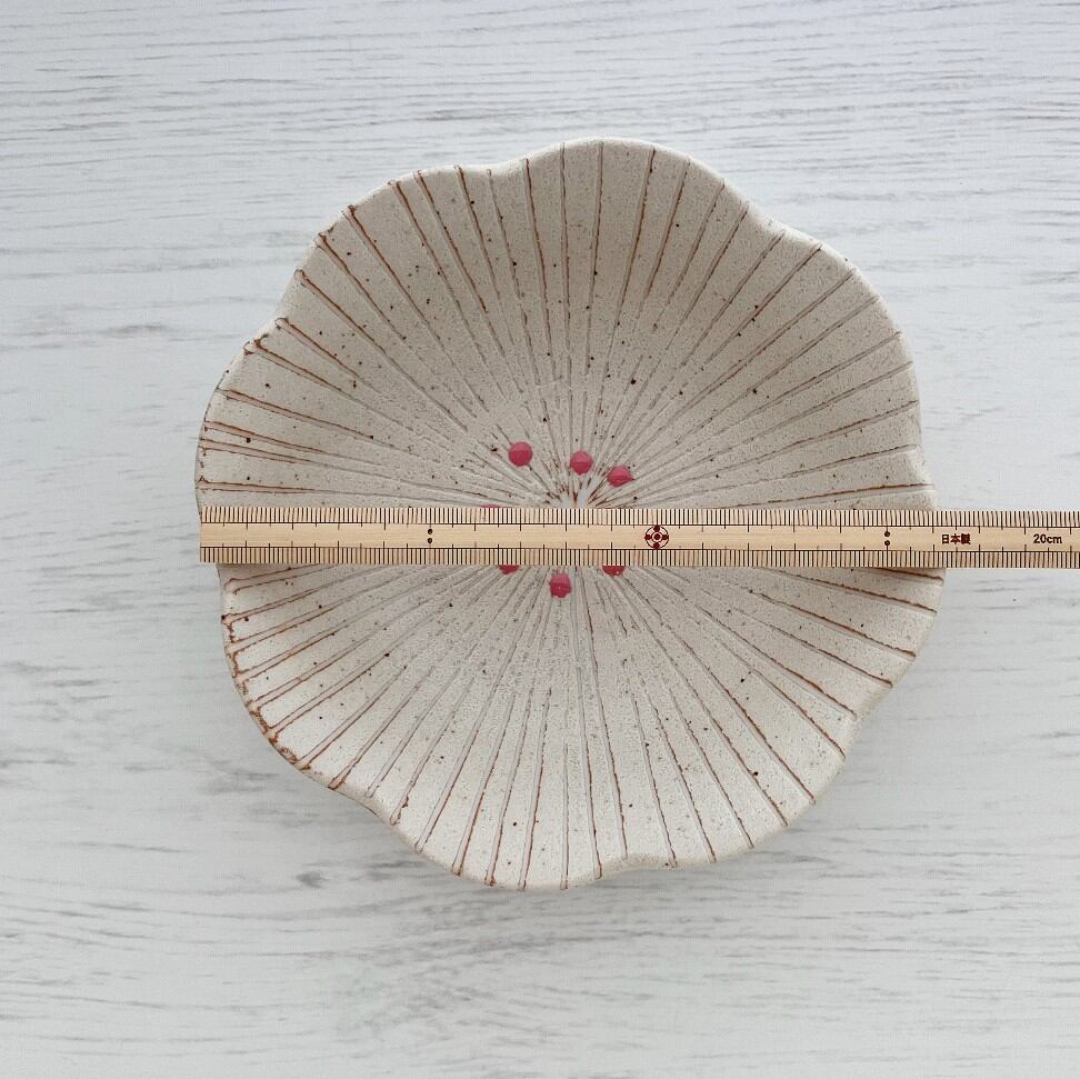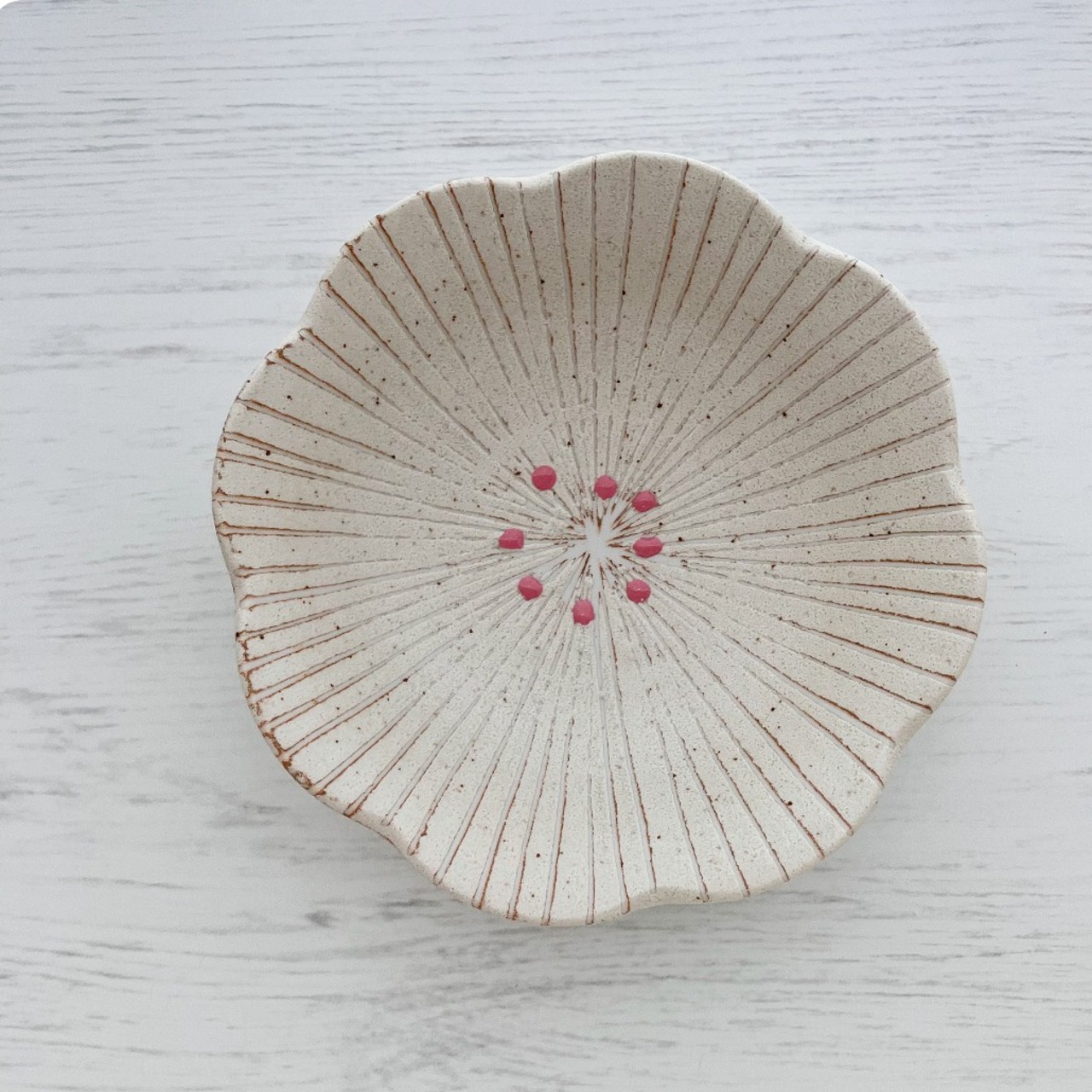 蕊風のイッチンでお花に見立てたデザインに、お菓子のようにやさしい風合いの釉薬をかけたうつわのシリーズ。