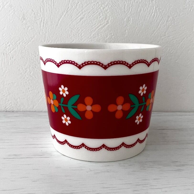 チロリアンテープのようなデザインがレトロでかわいいスープマグです。