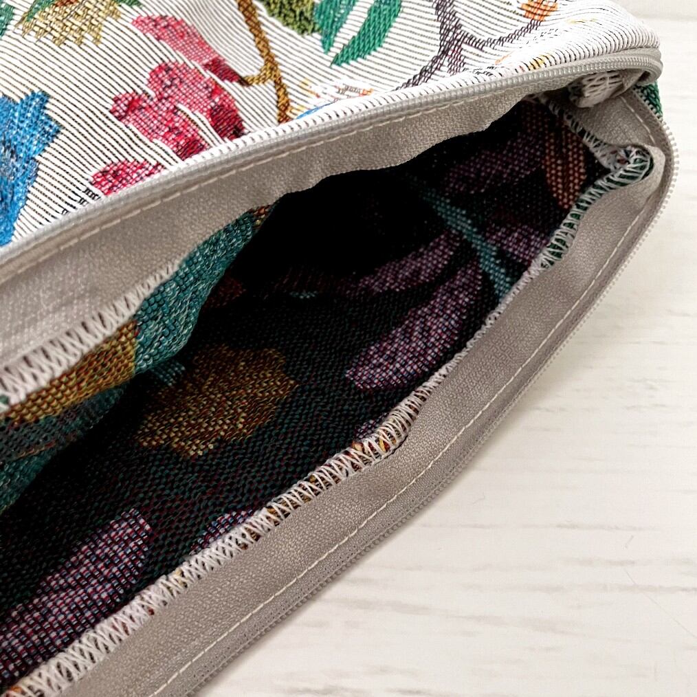 松尾ミユキさんによる、動物と植物の切り絵モチーフが広がる、ゴブラン素材のポーチです。