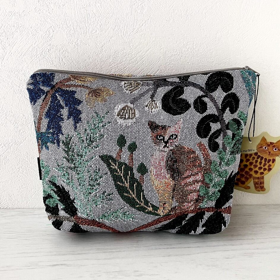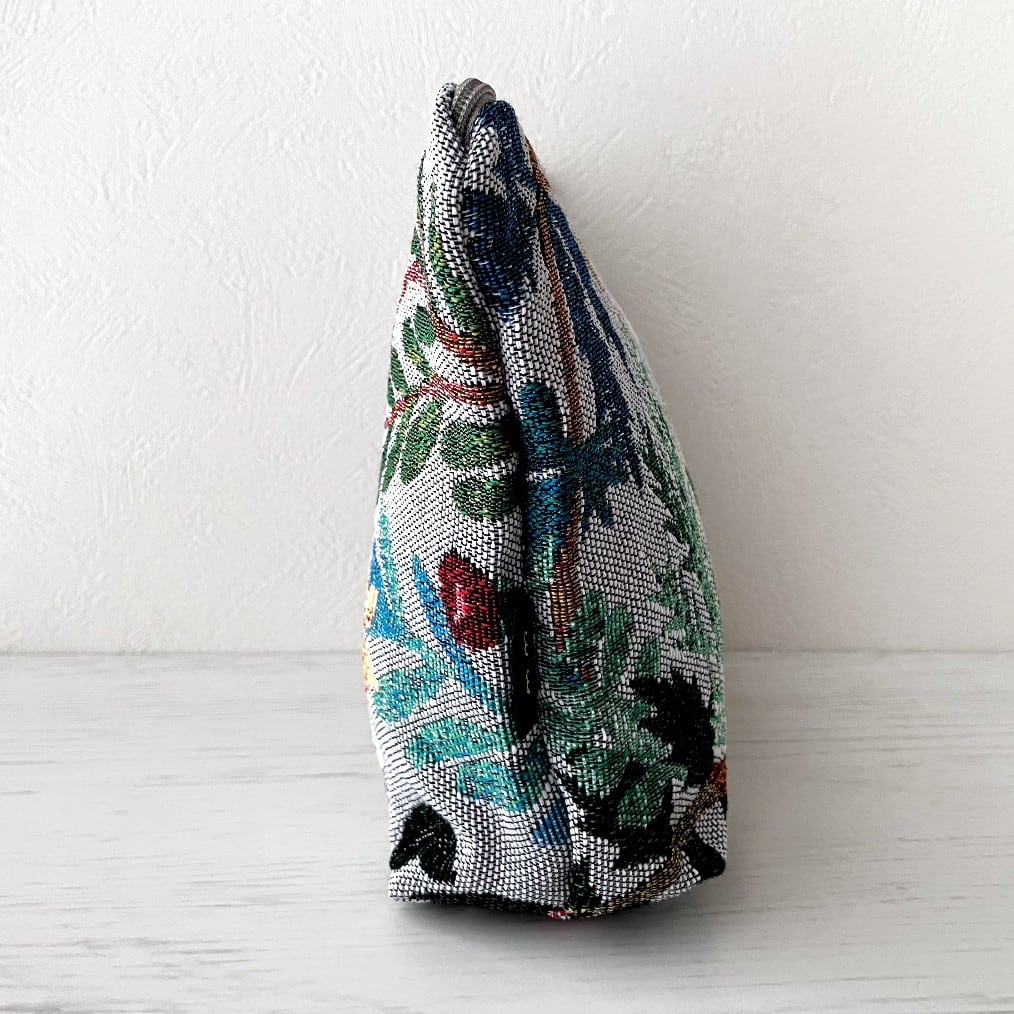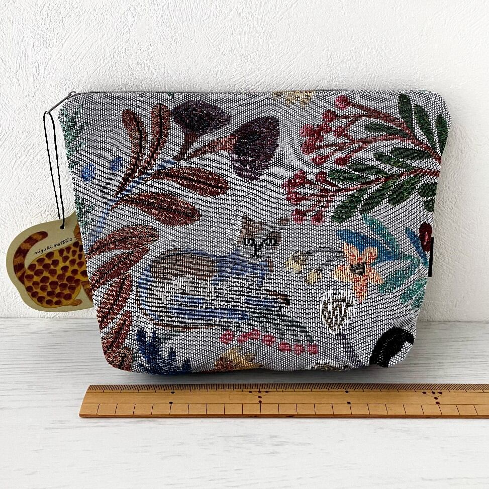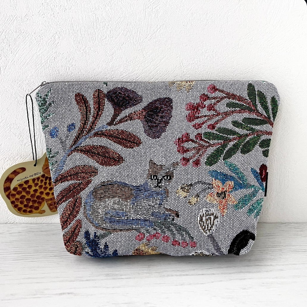 松尾ミユキさんによる、動物と植物の切り絵モチーフが広がる、ゴブラン素材のポーチです。