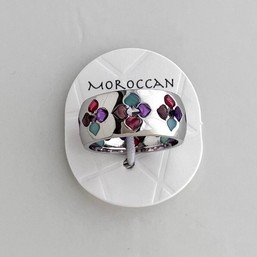 ステンドグラスのように透明な樹脂で色付けされたカラフルな「moroccan」シリーズ。幾何学的なお花模様が可愛い、すっくりとしたシンプルなリングです。