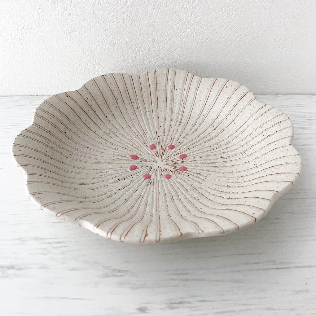 蕊風のイッチンでお花に見立てたデザインに、お菓子のようにやさしい風合いの釉薬をかけたうつわのシリーズ。