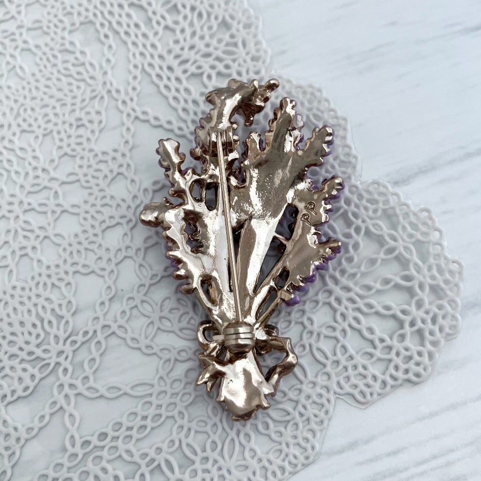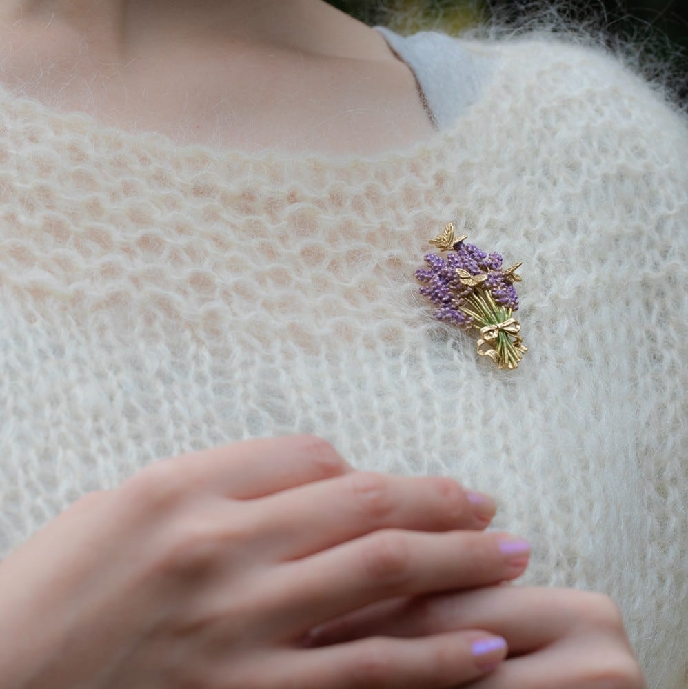 今にもほのかな香りが漂ってきそうな、ラベンダーの花束をモチーフにしたブローチ。