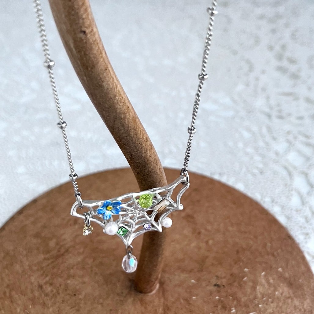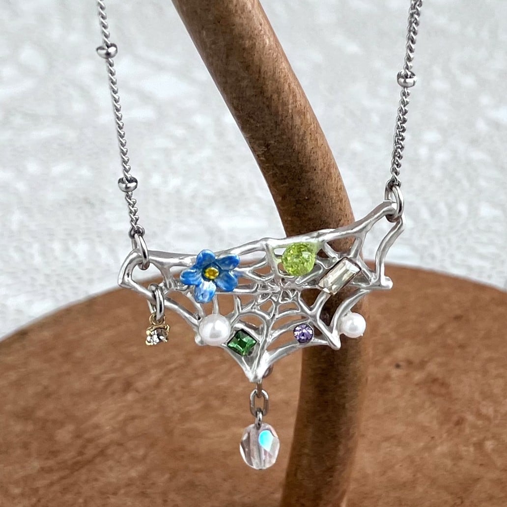 華やかに飾り付けられた、くもの巣をモチーフにしたネックレス。