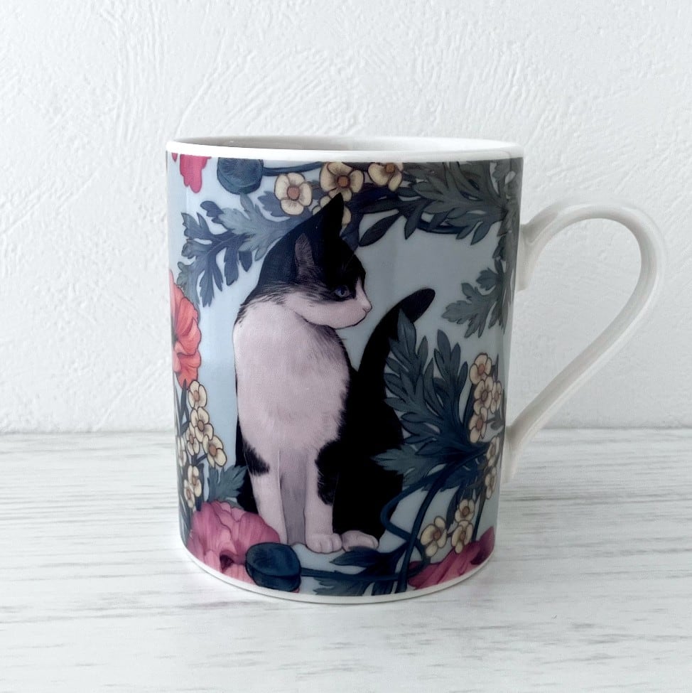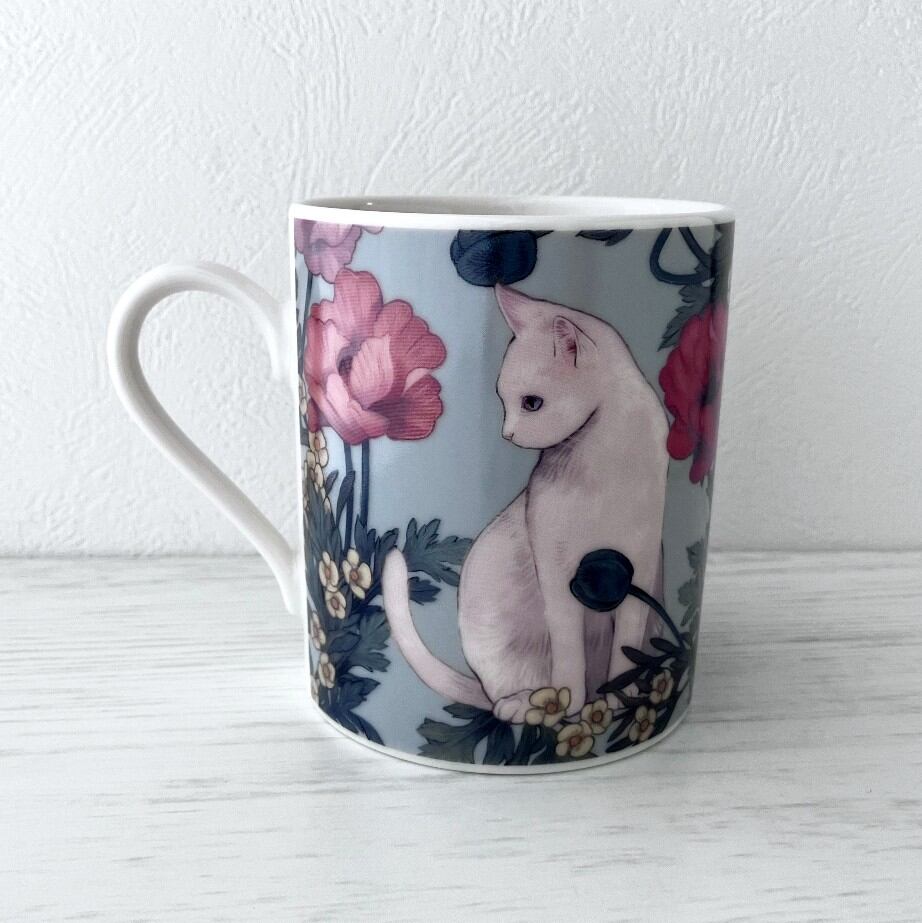 マグカップの中に、まるで小さな物語が閉じ込められているような美しさです。気品ある猫の優雅さが気持ちを落ち着かせてくれます。