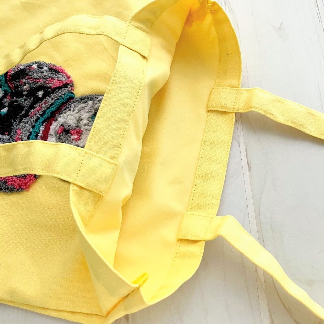刺しゅう部分はもこもことした手触りで立体的な仕上がりになっているのがポイントです。A4サイズがすっぽりと入るサイズ感で、持ち手が長めで肩にかけやすいのも◎