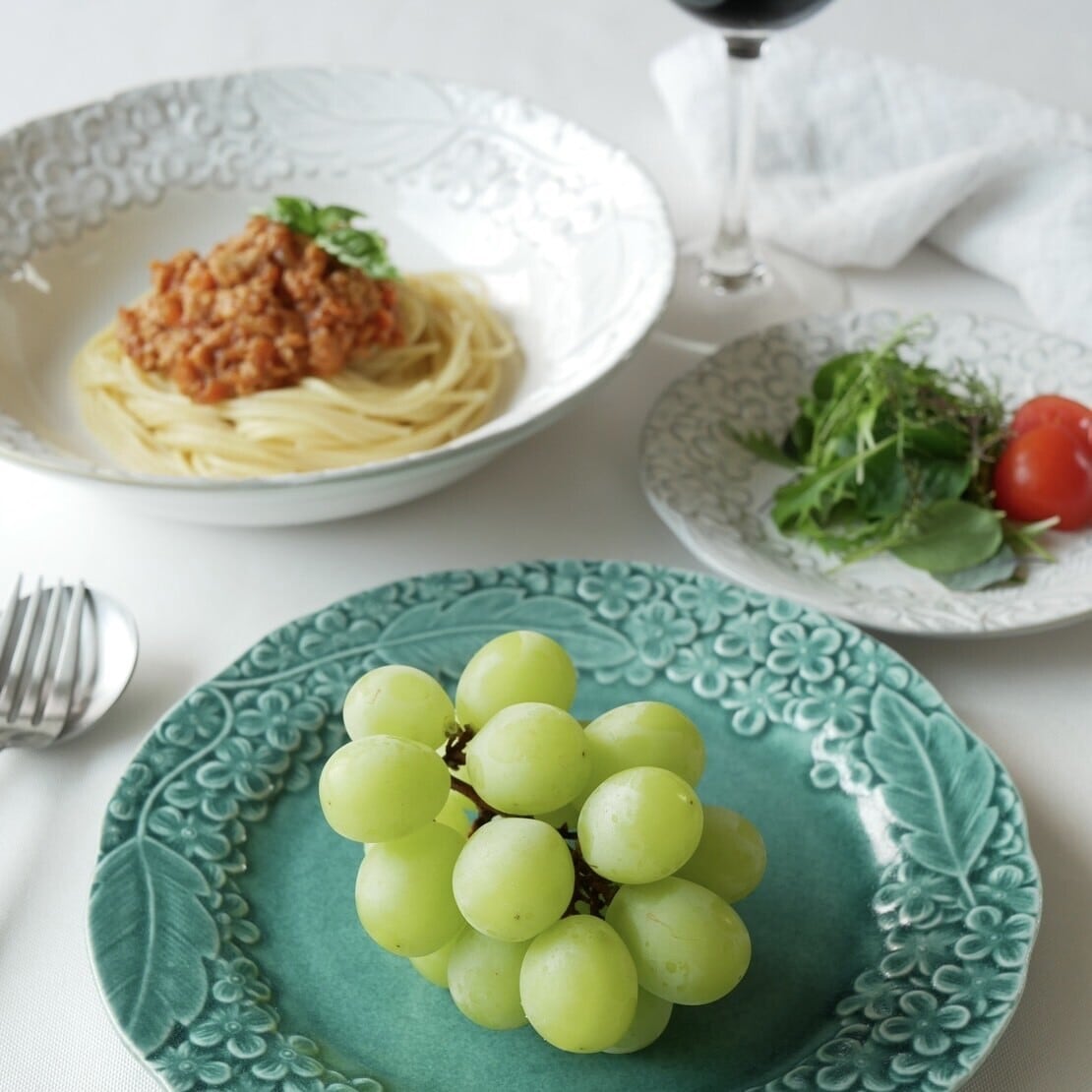 丁寧にデザインされたレリーフの花模様とシックな色目がテーブルシーンを優雅に演出してくれます。