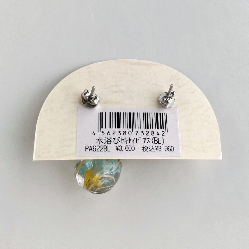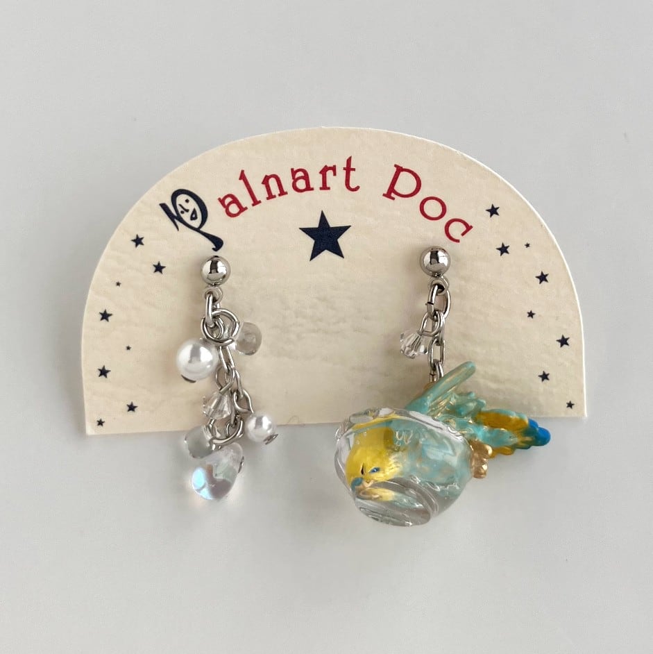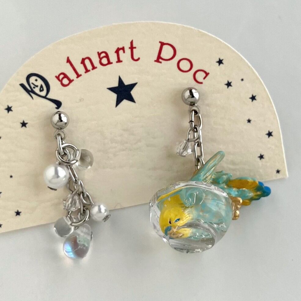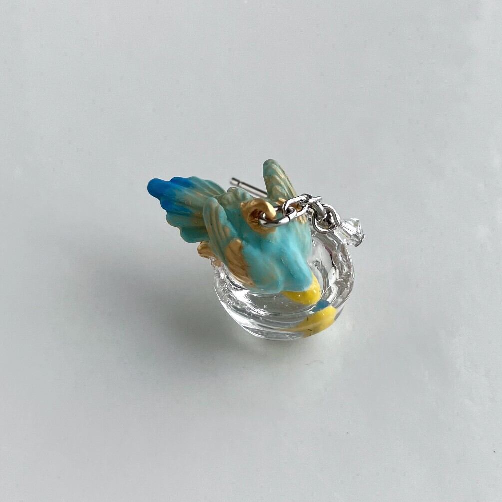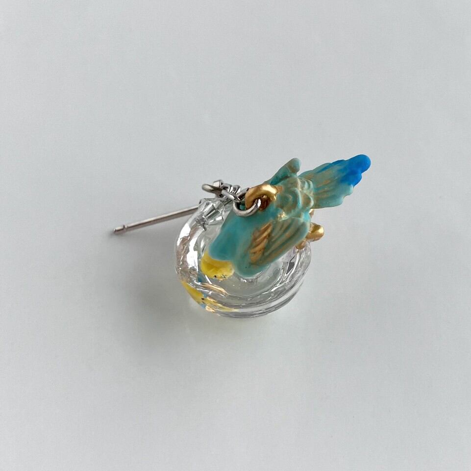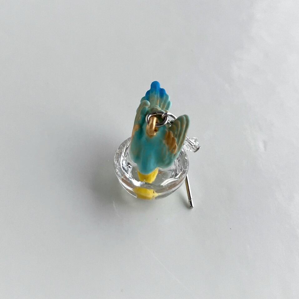 もう片方のピアスには、水しぶきをイメージしたビーズがキラキラと揺れ、豪快に水浴びするセキセイインコの姿を際立たせます。