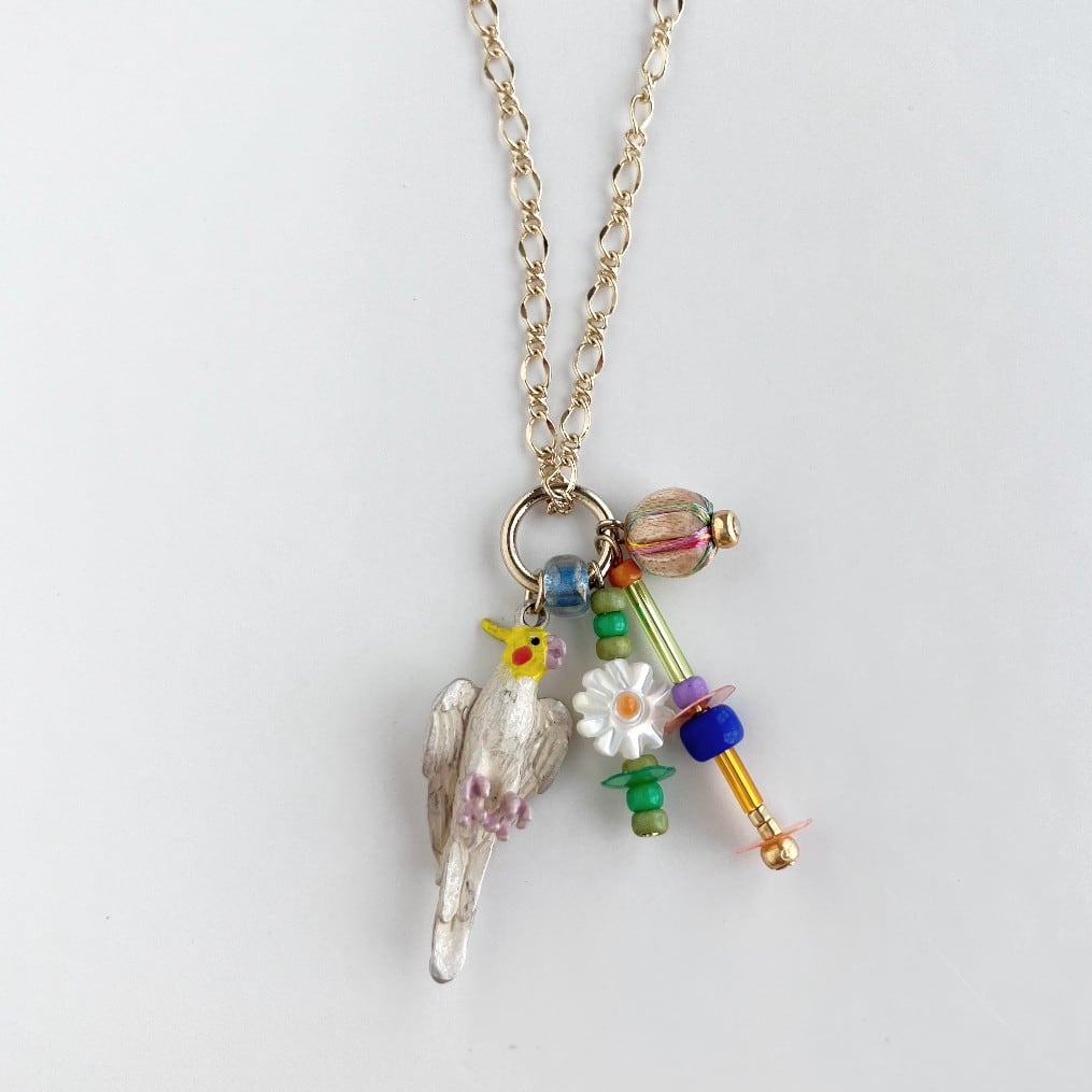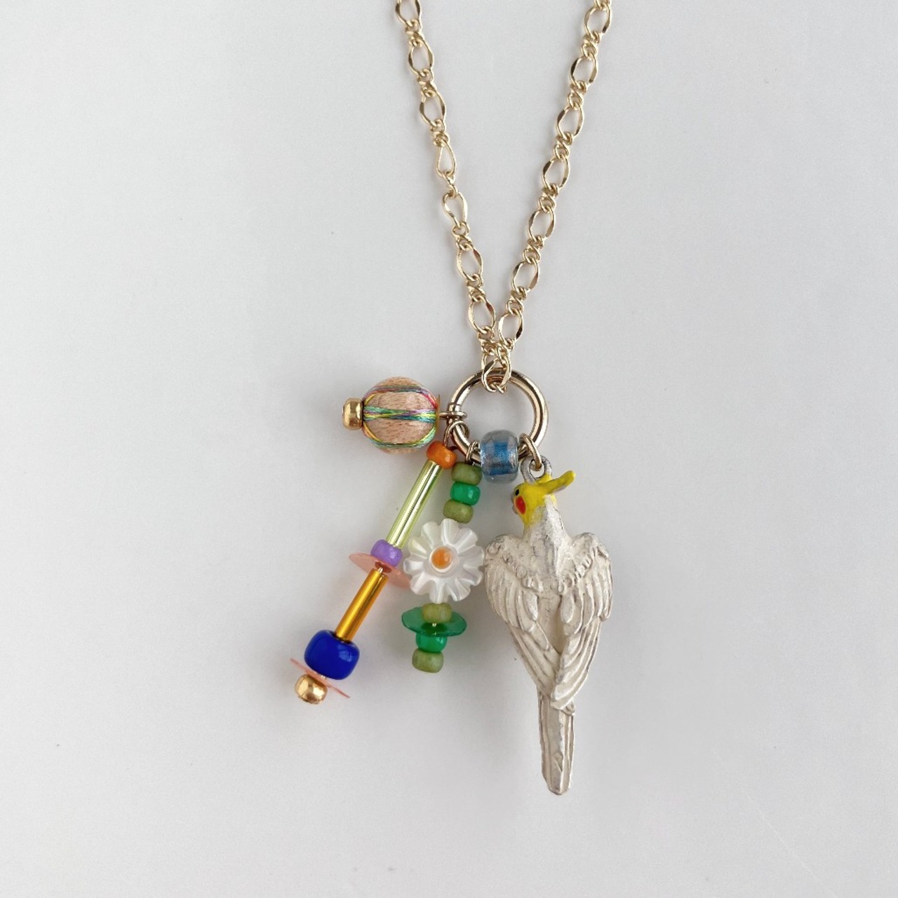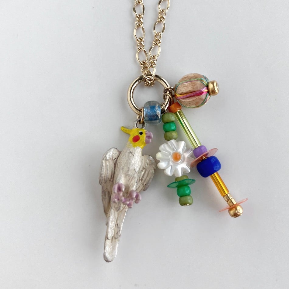 歌をうたいながら求愛するオカメインコをモチーフにしたネックレス。