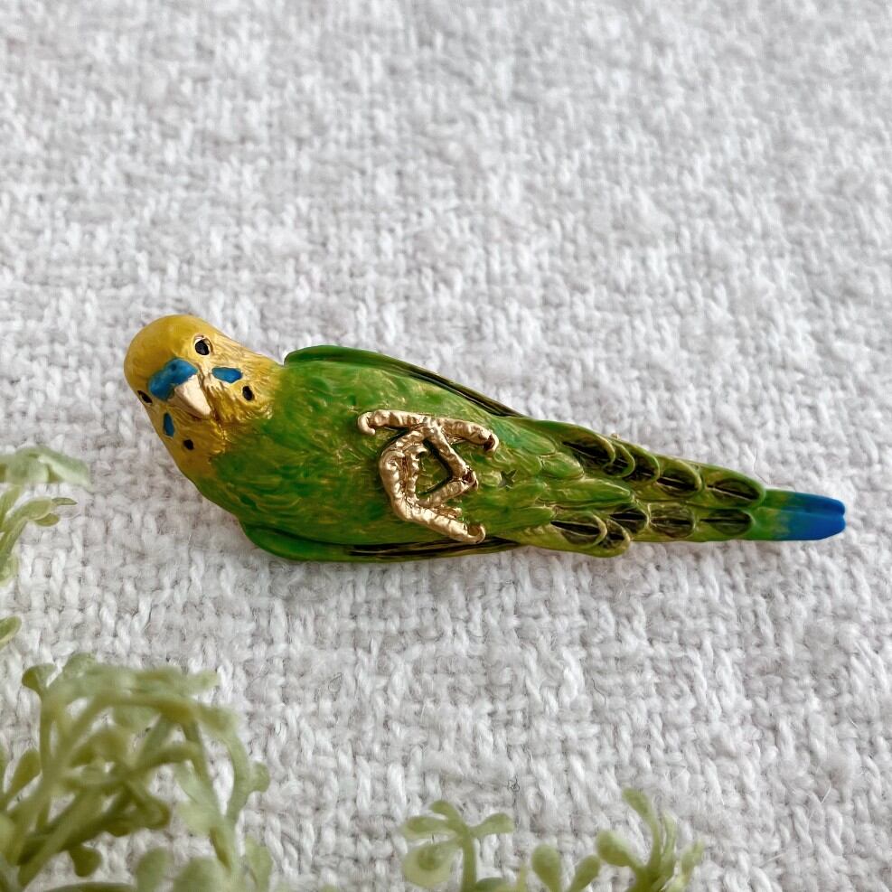 手のひらの上でまったりとリラックスするセキセイインコをモチーフにしたブローチ。