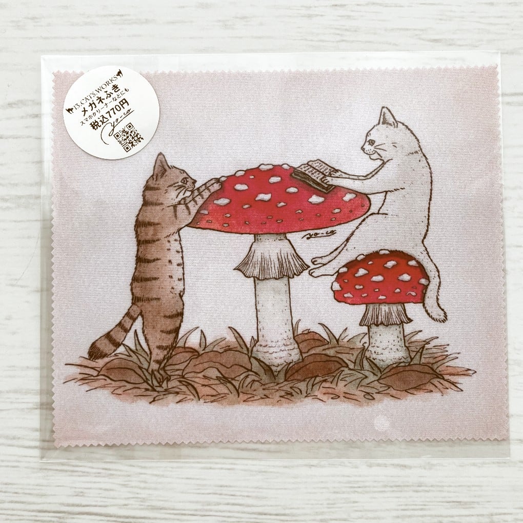 YO-COが個展「Hello,World!!〜キノコと猫の小さな絵本展〜」で発表した絵のメガネふきです。