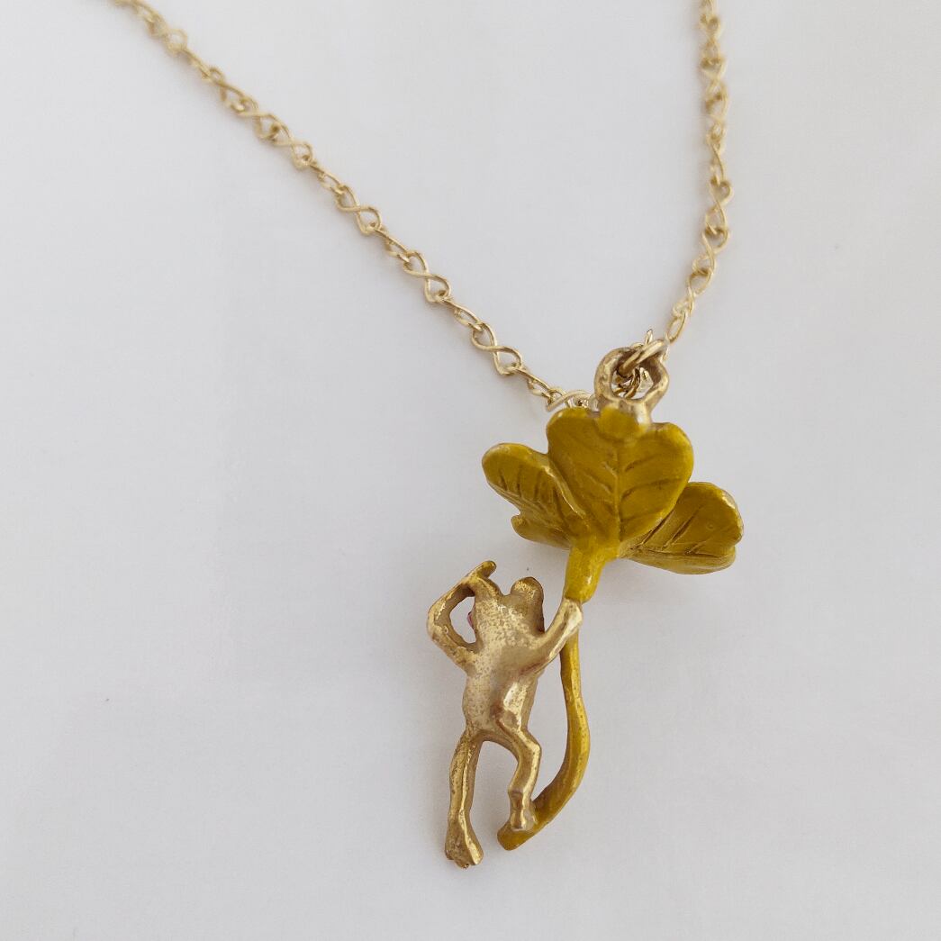 雨上がりにひょっこりと現れた、小さなカエルさんのネックレスです。若草色の四つ葉を片手に、ご機嫌な様子。そのままふわりと風にのって幸せを運んで来てくれる、なんとも可愛いやつです。幸運のクローバーにひょいっと乗っかりゲロゲロと歌うあの姿を今日も探してしまいます。