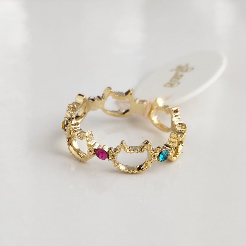 ネコのシルエットが連なった華奢なデザインのリングです。光に反射してキラリと光るストーンが可愛いさを引き立たせてくれます。