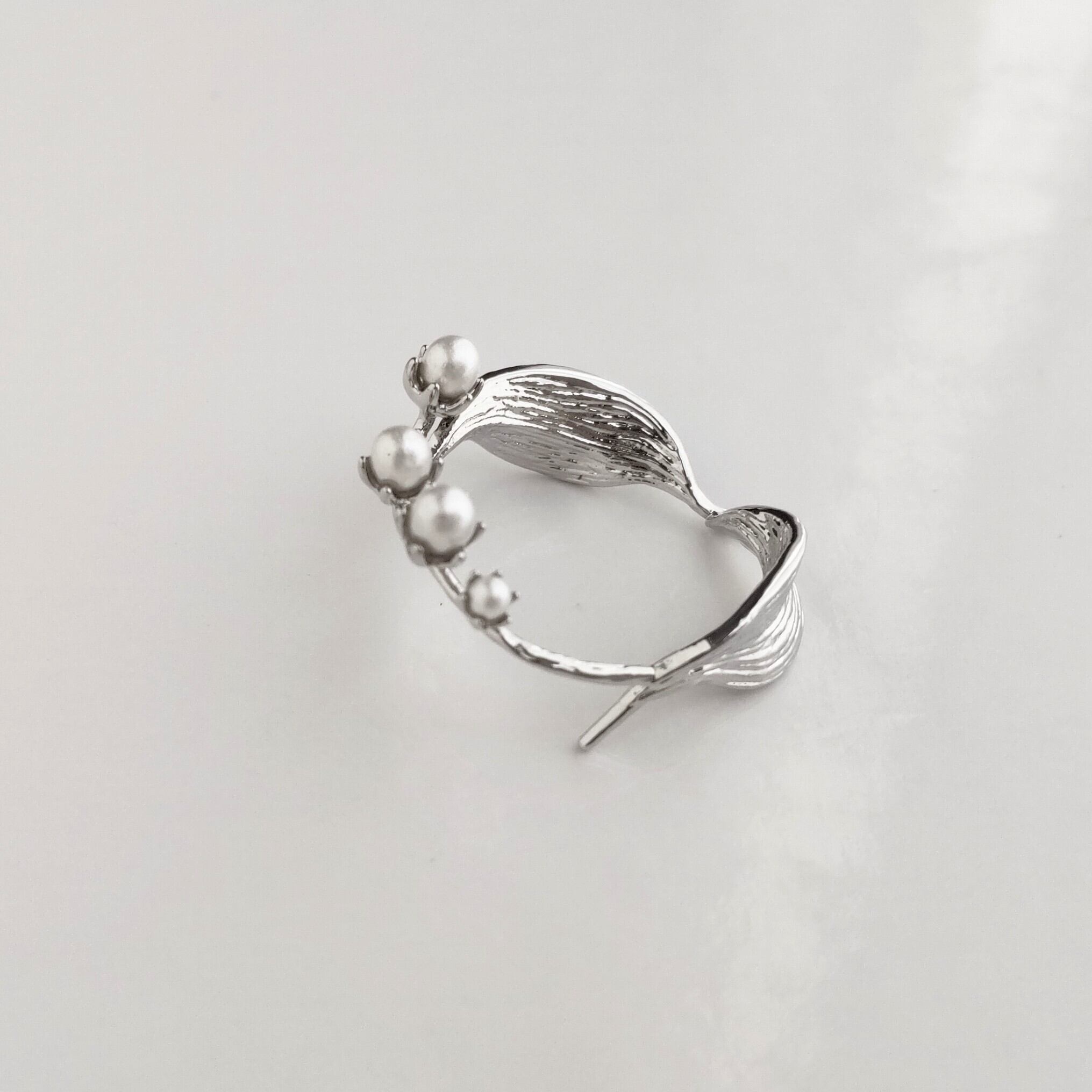 小さなパールを使って生き生きとユリの花を表現した上品なリングです。白いパールと金属のゴールドカラーの美しいカラーバランスがとても魅力的なアイテムです。