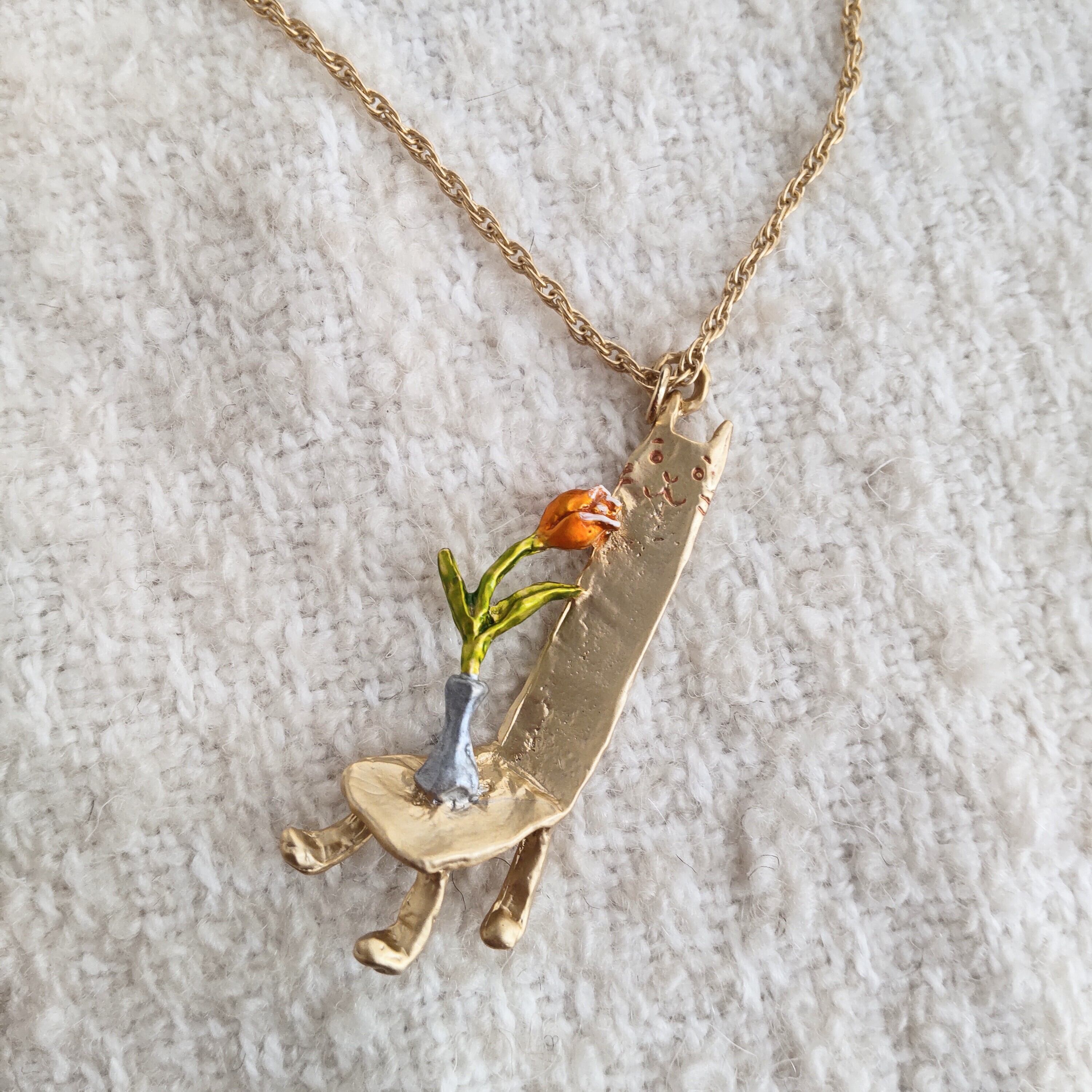 鮮やかなチューリップを飾る一輪挿しが背もたれの高い椅子の上に乗っている個性的なデザインのネックレス。