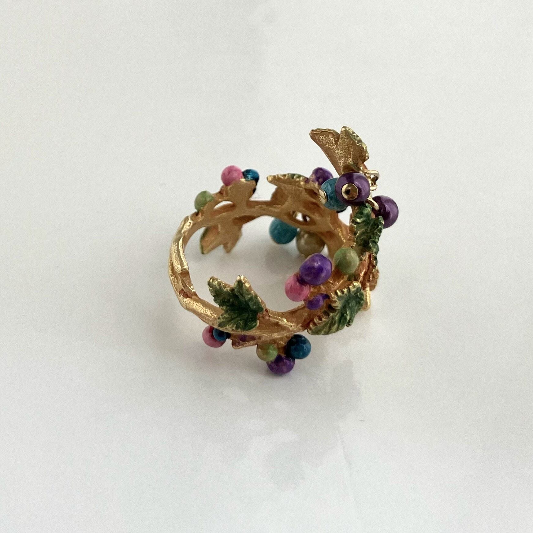 指に巻き付いて鮮やかな果実を実らせるノブトウのリング。