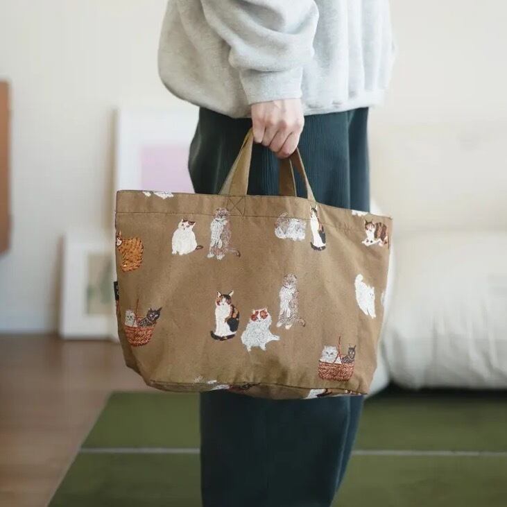 さまざまな表情やしぐさをみせてくれるネコ達がたくさん織り込まれた舟形トート。